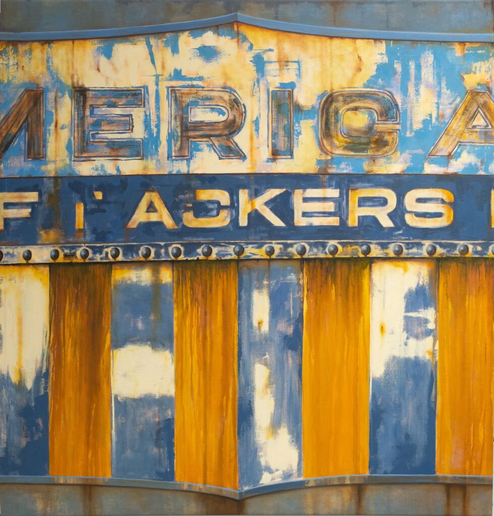 La obra fusiona metales reciclados con trazos suaves y colores tierra.
